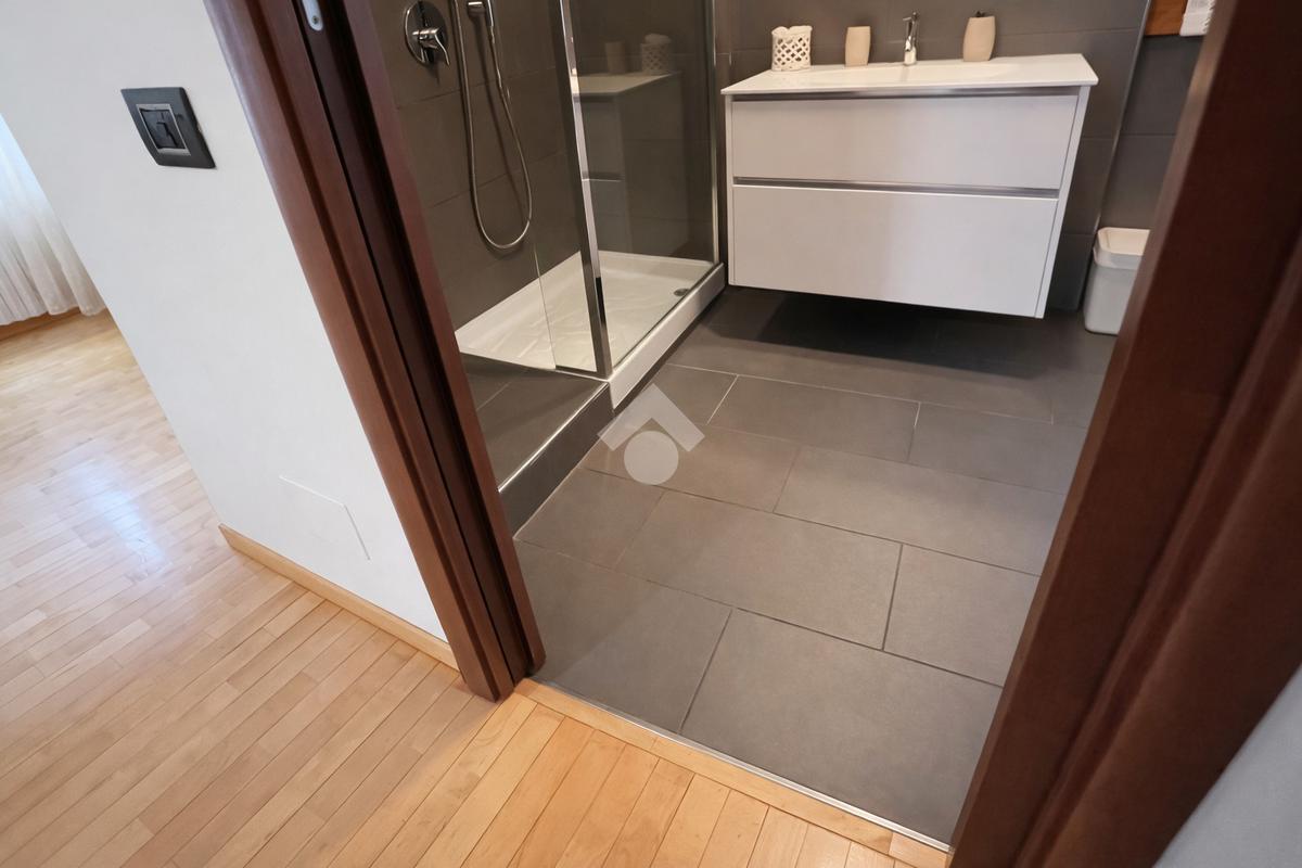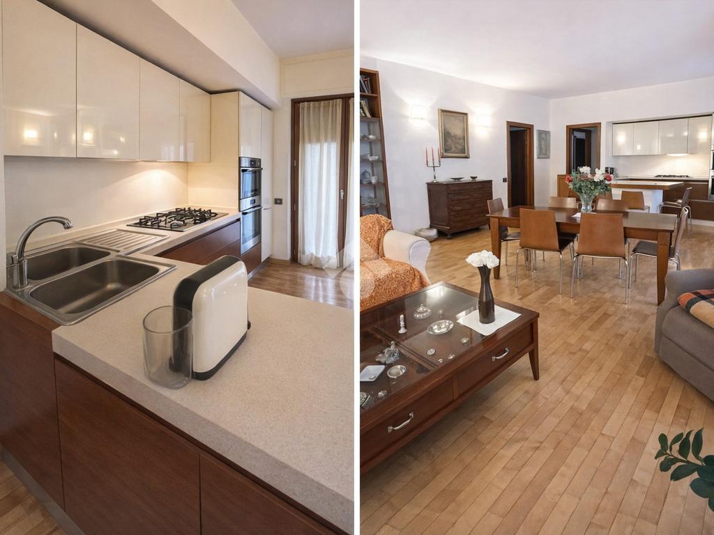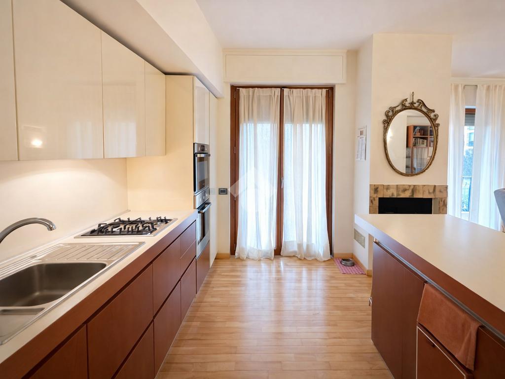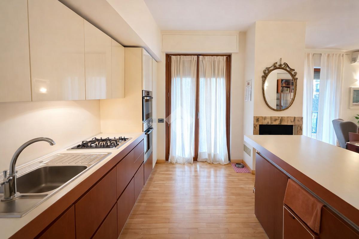 L’ingresso introduce in un salone doppio luminoso, con accesso diretto al terrazzo soleggiato, ideale per momenti di relax e convivialità. La zona cucina è aperta, perfettamente integrata con l’area living.